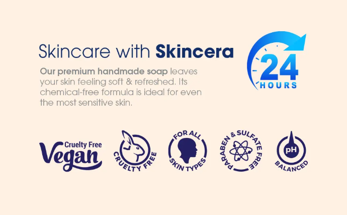 This combo pack contains Orange Soap (3 x 125 g), all vegan & handcrafted with rich, natural ingredients. Skincera Glycerine moisturizing soap gently cleanses while leaving your skin hydrated, soft, smooth, and nourished every day. Leaves your skin feeling soft and refreshed. Its chemical-free formula is ideal for even the most sensitive skin.